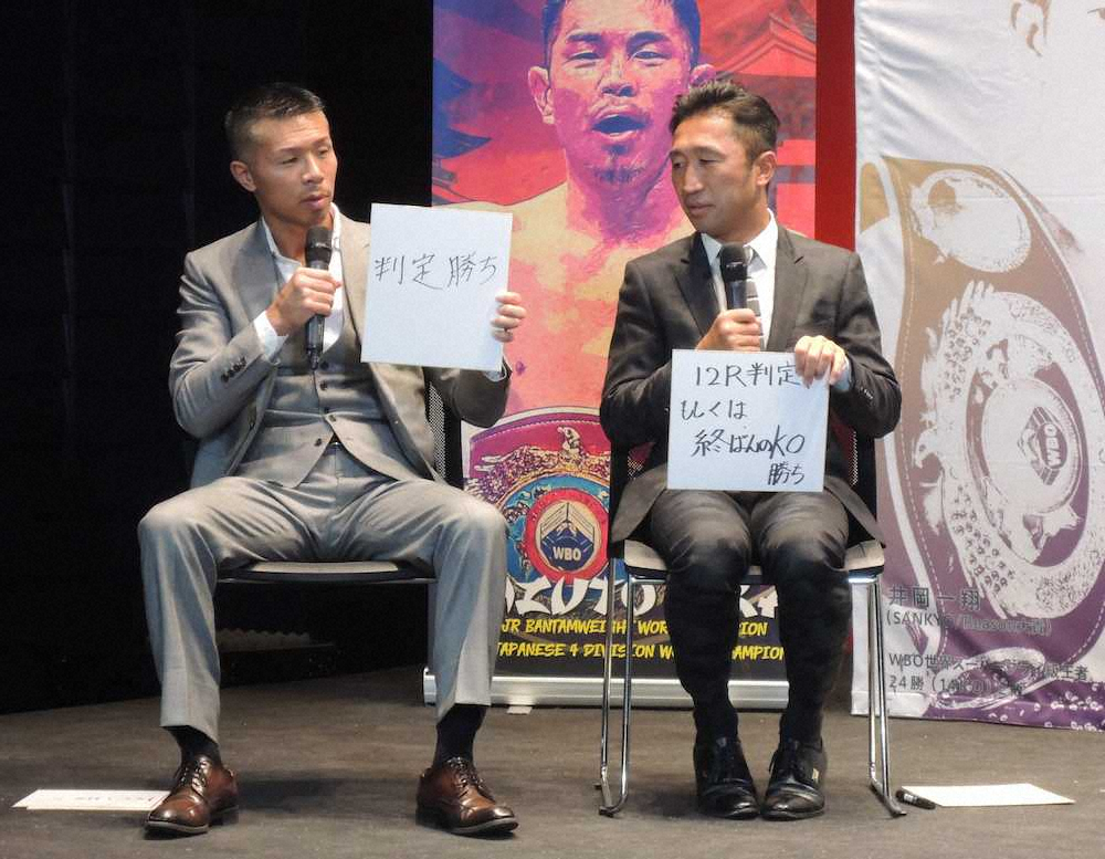 試合の結果予想はWBO世界フライ級王者・田中恒成(24=畑中)がともに「KO勝ち」と予想したが、WBO世界スーパーフライ級王者・井岡一翔(30=Reason大貴)については内山氏が「判定勝ち」、内藤氏は「12回判定か終盤KO」と、微妙に分かれた。