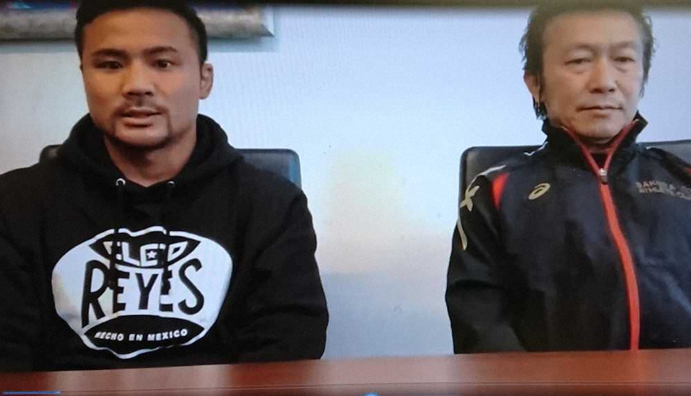 リモートで会見した比嘉大吾(左)と野木丈司トレーナー