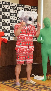 京太郎は知名度の低い対戦相手をPRするため、実方の写真をプリントしたTシャツを着用して会見に登場した。「年長者を倒してほしいという気持ち」と殊勝な発言をしたかと思えば、「蹴りは使いません。痛いことが分かったので。パンチだけでいくという作戦を思い付いた」と言いたい放題。「自信はない」「ギャラが同じなら対戦相手は弱い方がいい」「才能があるんですよ」と支離滅裂な発言を繰り返し、会場を幻惑していた。