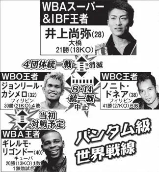 ドネアVSカシメロが消滅し、勝者と井上が対戦する計画も白紙。早ければ年内にも実現可能だった4団体統一戦は難しい状況となった。ただ、カシメロは当初、8月14日に対戦予定だったリゴンドー戦が再浮上しているものの、井上との対戦には意欲的でドネアも井上との再戦に前向き。「一本ずつ取りにいくか。まだバンタム級でもやれそうだしちょうどいい」ともつづった井上。4団体統一への道は自らの拳で切り開いていくつもりだ。