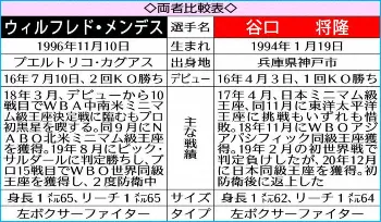 谷口は19年2月に当時王者だったビック・サルダール(フィリピン)に挑戦も0―3で判定負け。同年8月にそのサルダールに勝って王者となったのがメンデスだった。「僕が負けたサルダールに、メンデス選手はしっかり勝ってきた。その相手に勝ち切ったので、2年前の自分よりもずっと強くなれたと、ようやく自信が持てました」と語った。
