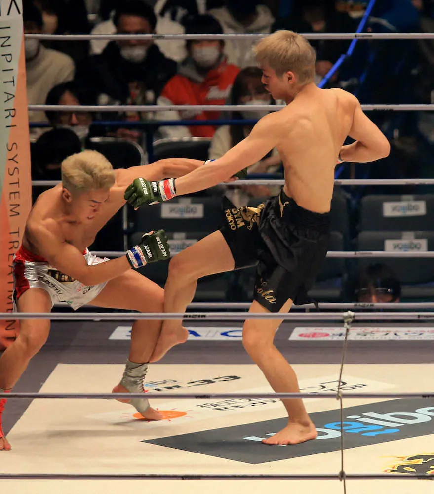 <RIZIN33>三浦孝太(右)の蹴りを受けるYUSHI(撮影・篠原岳夫)