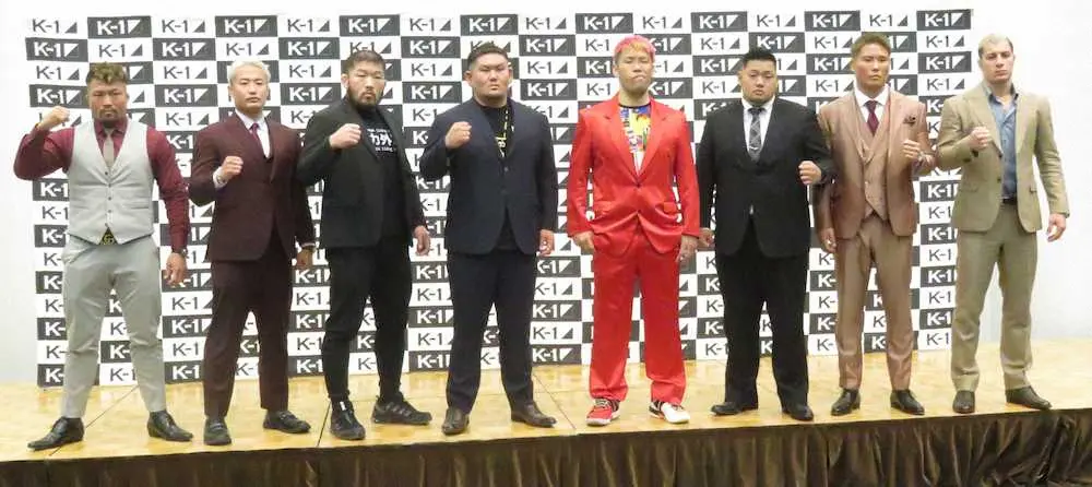 K-1無差別級トーナメントに出場する(左から)ANIMAL☆KOJI、谷川聖哉、石井慧、実方宏介、京太郎、坂本英則、K-Jee、マハムード・サッタリ