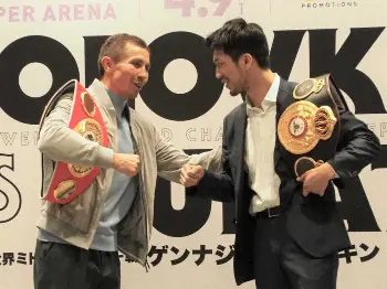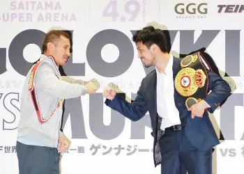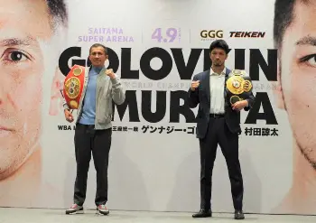 会見後、健闘を誓い合うゴロフキン(左)と村田諒太 Photo by スポニチ 村田諒太、笑顔でゴロフキンとグータッチ「素晴らしい試合をお届けする」 ギャラリーで見る この記事のフォト 2022年04月07日の画像一覧 もっと見る 2022年04月07日の画像をもっと見る