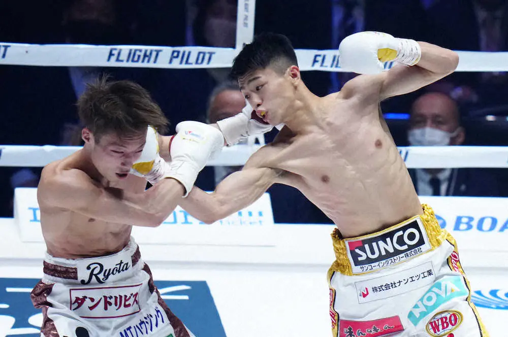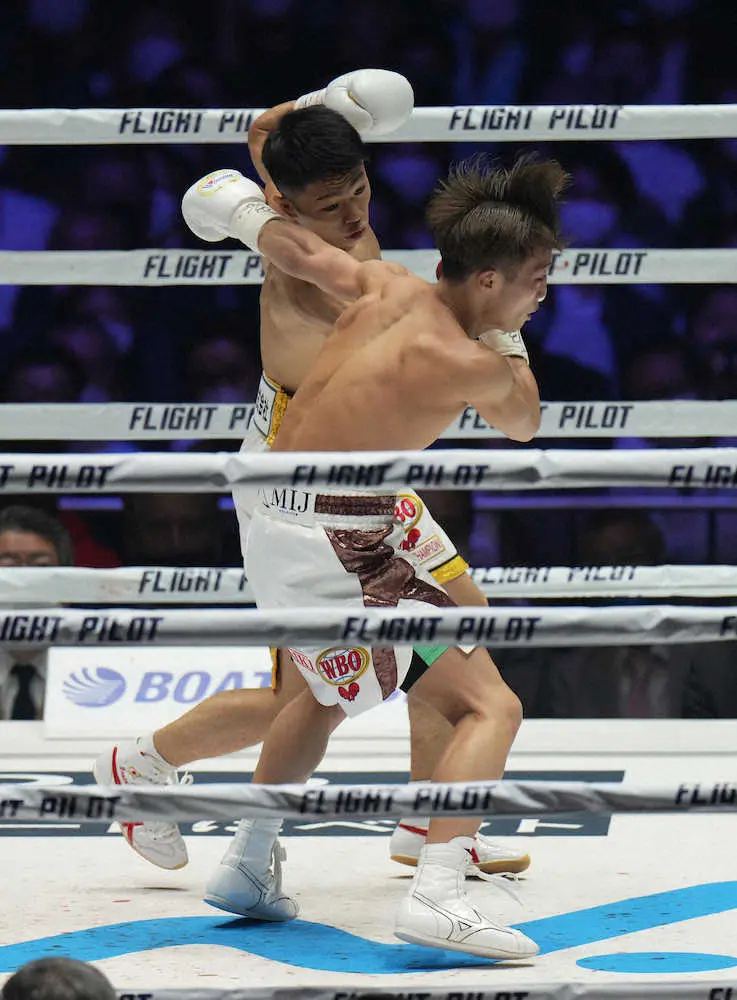 <WBO世界フライ級タイトルマッチ 中谷潤人・山内涼太>7回、山内(左)にボディーを浴びせる中谷(撮影・沢田 明徳) Photo by スポニチ 中谷潤人V2 無敗のネクスト・モンスター「いずれはパウンド・フォー・パ… ギャラリーで見る この記事のフォト 2022年04月09日の画像一覧 もっと見る 2022年04月09日の画像をもっと見る