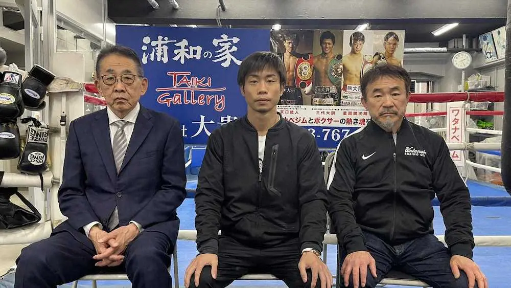 取材に応じたワタナベジムの(左から)渡辺会長、谷口、伯耆トレーナー(提供・ワタナベジム)