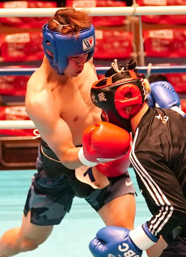 プロテストで3Rのスパーリングする堤駿斗(左)=撮影・郡司 修
