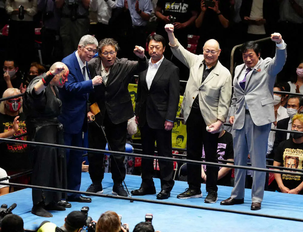 ジャンボ鶴田さん二十三回忌追善興行でポーズを決める(左から)カブキ、田上、天龍、川田、渕、小橋(撮影・島崎忠彦)