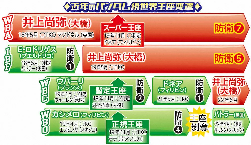 WBA・WBC・IBF世界バンタム級王座統一戦12回戦 ○WBAスーパー&IBF王者・井上尚弥 TKO2回1分24秒 WBC王者ノニト・ドネア● ( 2022年6月7日 さいたまスーパーアリーナ )