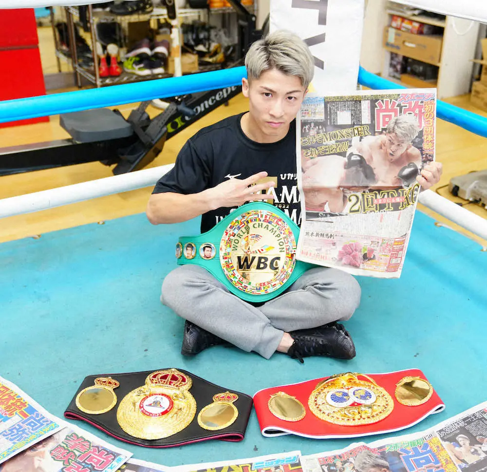 <井上尚弥一夜明け会見>3本のベルトを手にガッツポーズの井上(撮影・島崎忠彦) Photo by スポニチ 3団体統一の尚弥「今は練習がしたい」に報道陣ビックリ 視聴数は歴代トッ… ギャラリーで見る この記事のフォト 2022年06月08日の画像一覧 もっと見る 2022年06月08日の画像をもっと見る