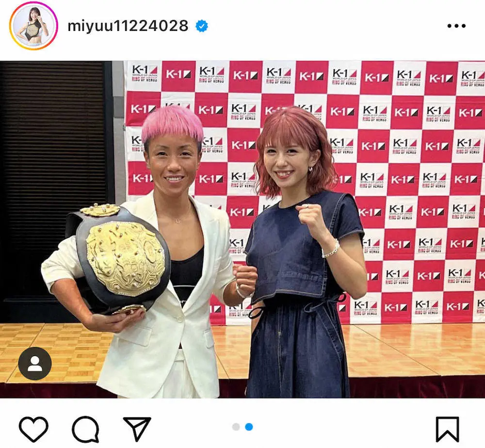 「計量クリアしました。誰よりも楽しんできます!最高の1日を。応援よろしくお願いします!押忍!」と計量を終えて、試合への意気込みをつづり、計量時の花柄ビキニの写真とジムメートで今大会では防衛戦に臨むK―1女子フライ級王者KANAとの2ショット写真とともに投稿した。