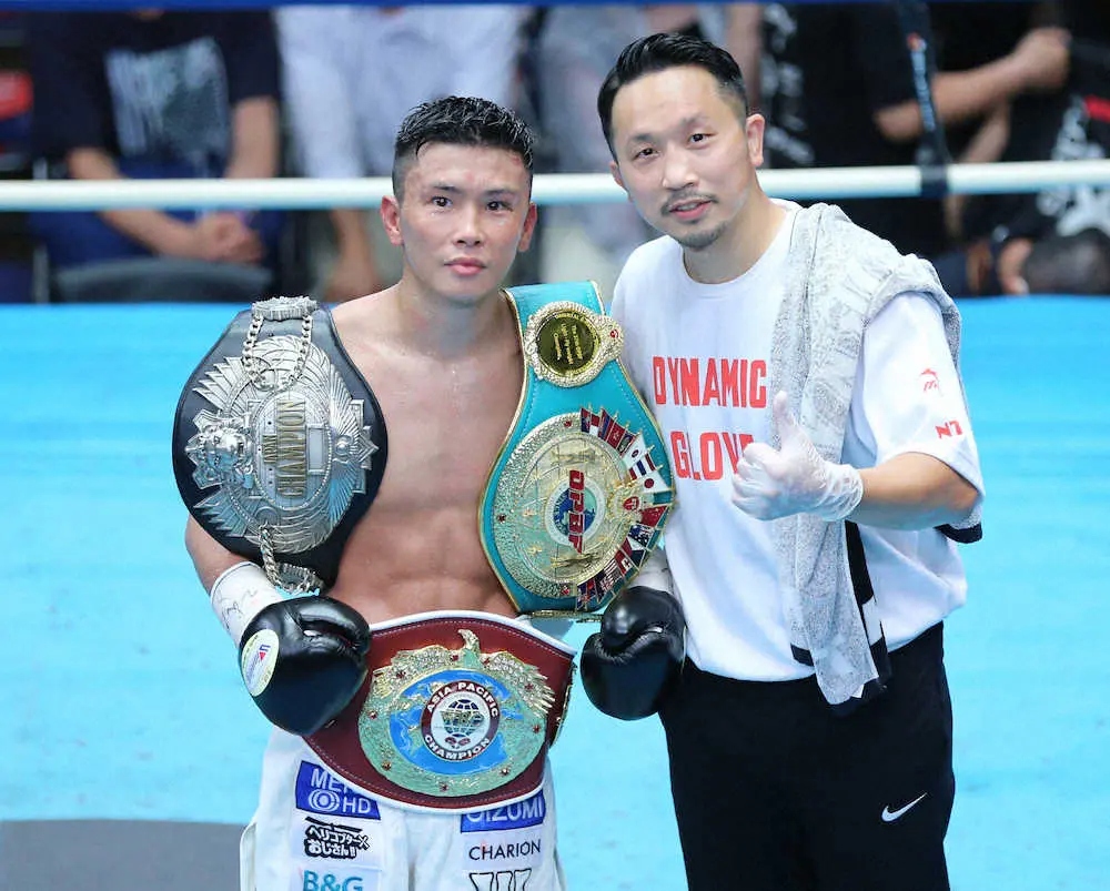 3本のベルトを巻き、粟生トレーナー(右)と記念撮影する岩田(撮影・光山 貴大)