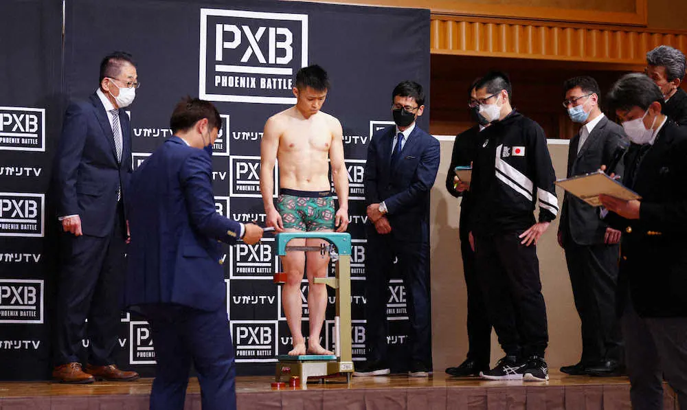 1回目の計量で体重超過した石沢(撮影・島崎忠彦)