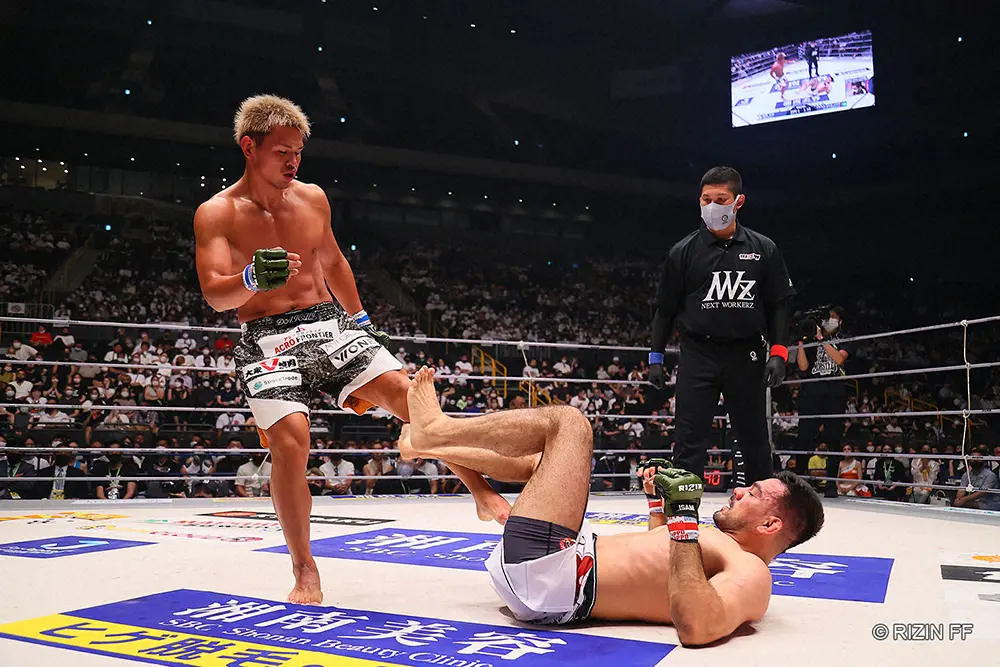 阿部大治(左)に攻められるマルコス・ヨシオ・ソウザ(C)RIZIN FF
