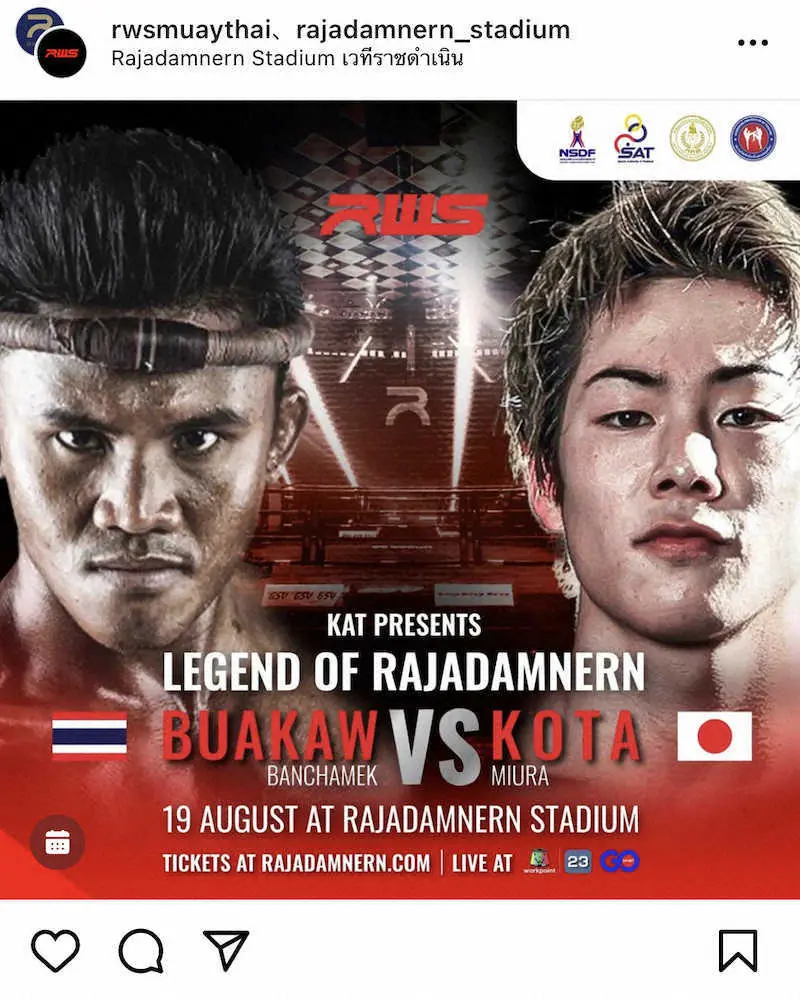 19日にタイのラジャダムナンスタジアムで行われる「ラジャダムナン・ワールド・シリーズ(RWS)」で格闘家の三浦孝太(20=BRAVE)と元K―1 MAX世界王者のブアカーオ・バンチャメーク(40=タイ)のキックボクシングのエキシビジョンマッチが開催されると1日に正式発表された。