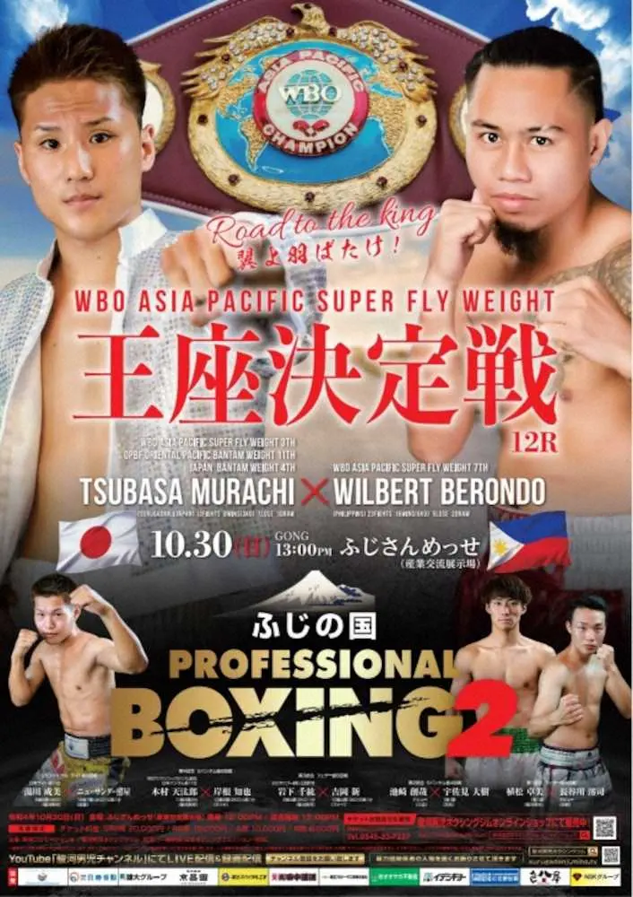 ボクシングの駿河男児ジムは12日、同ジム所属の村地翼(25)が10月30日に静岡県富士市のふじさんめっせでWBOアジア・パシフィック・スーパーフライ級王座決定戦12回戦に出場すると発表した。村地は同級3位で、同級7位のウィルベルト・ベロンド(26=フィリピン)と対戦する。WBOアジア・パシフィックのタイトルマッチが静岡県内で開催されるのは初めて。