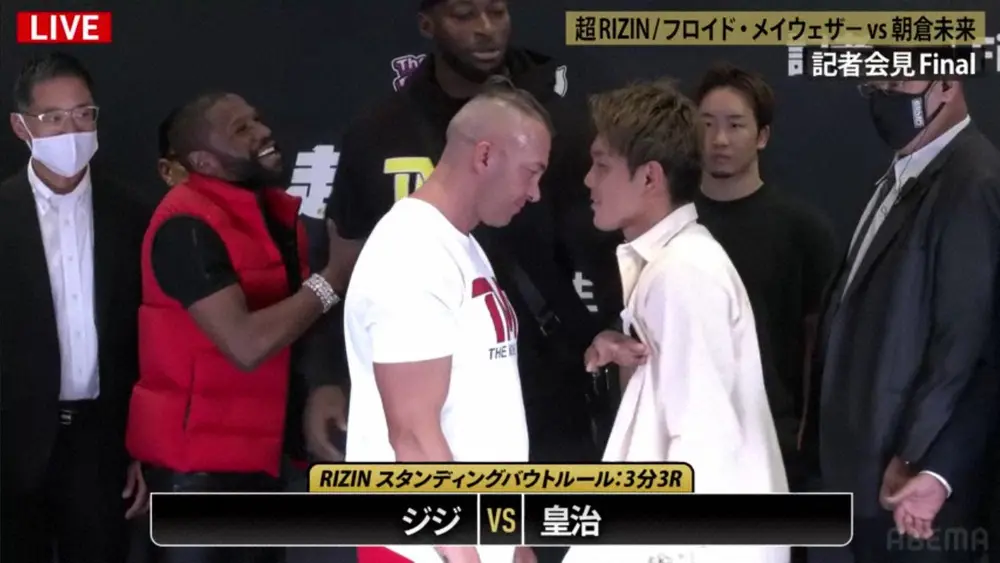 フェースオフするジジ(左)とメイウェザーのお面を持つ皇治 Photo by スポニチ 皇治「路上の伝説と路チューの伝説が並んだ」中指を立ててメイウェザーの… ギャラリーで見る この記事のフォト 2022年09月21日の画像一覧 もっと見る 2022年09月21日の画像をもっと見る
