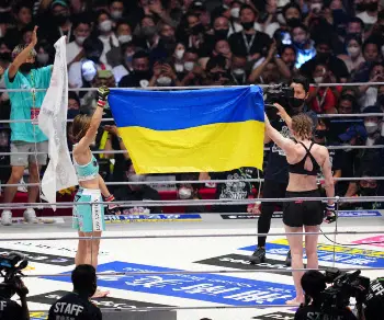<RIZIN38>勝利した伊沢(左)はアナスタシアとともにウクライナの国旗を掲げる(撮影・島崎忠彦) Photo by スポニチ スーパーアトム級トーナメントは伊沢星花VSパク・シウで決勝 準決勝敗退… ギャラリーで見る この記事のフォト 2022年09月25日の画像一覧 もっと見る 2022年09月25日の画像をもっと見る