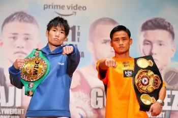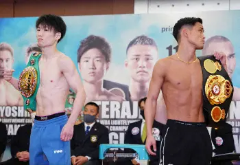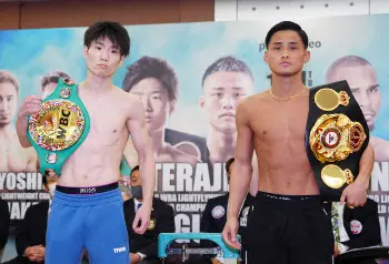 <WBC&WBA世界ライトフライ級王座統一戦 寺地拳四朗・京口紘人>会見に臨む(左から)中谷正義、吉野修一郎、寺地拳四朗、京口紘人、ジョナサン・ゴンサレス、岩田翔吉、中谷潤人、フランシスコ・ロドリゲスジュニア(撮影・小海途 良幹) Photo by スポニチ 11・1スーパーフライ級デビューの中谷潤人は200グラムアンダーでパス「体… ギャラリーで見る この記事のフォト 2022年10月31日の画像一覧 もっと見る 2022年10月31日の画像をもっと見る