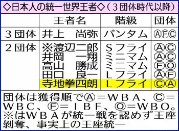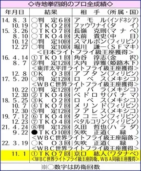 ◇寺地 拳四朗(てらじ・けんしろう)1992年(平4)1月6日生まれ、京都府城陽市出身の30歳。奈良朱雀高―関大。アマ74戦58勝(20KO)16敗。14年8月プロデビュー。元日本ライトフライ級王者、元東洋太平洋同級王者。17年5月、WBC世界同級王座を獲得して8度防衛。21年9月、矢吹正道(緑)に10回TKO負けで陥落も22年3月の再戦に3回KO勝ちして王座復帰。1メートル65の右ボクサーファイター。父・永(ひさし)BMBジム会長は元東洋太平洋ライトヘビー級王者。