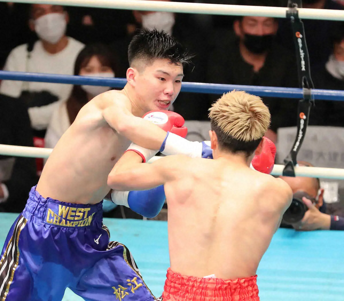 <全日本新人王決勝戦>Lフライ級 服部(右)を判定で破った松江(撮影・村上 大輔)