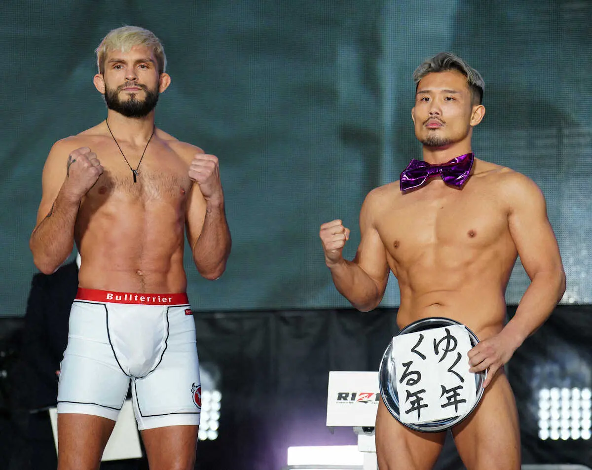 第4試合に出場する大尊伸光(たいそん・のぶみつ、36)は衣服を身にまとわず、おぼん1枚で登場した。71キロ契約のところ、70.90キロでなんとかパス。お笑い芸人・アキラ100%のように素早くおぼんをひっくり返すとそこには「ゆく年くる年」の文字。司会者から「まさに大尊100%」と声をかけられるなど、気温7度の寒空の下、会場を盛り上げた。明日は、18年の大みそか以来4年ぶりとなるRIZINの舞台でジョニー・ケース(33=米国)と対戦する。