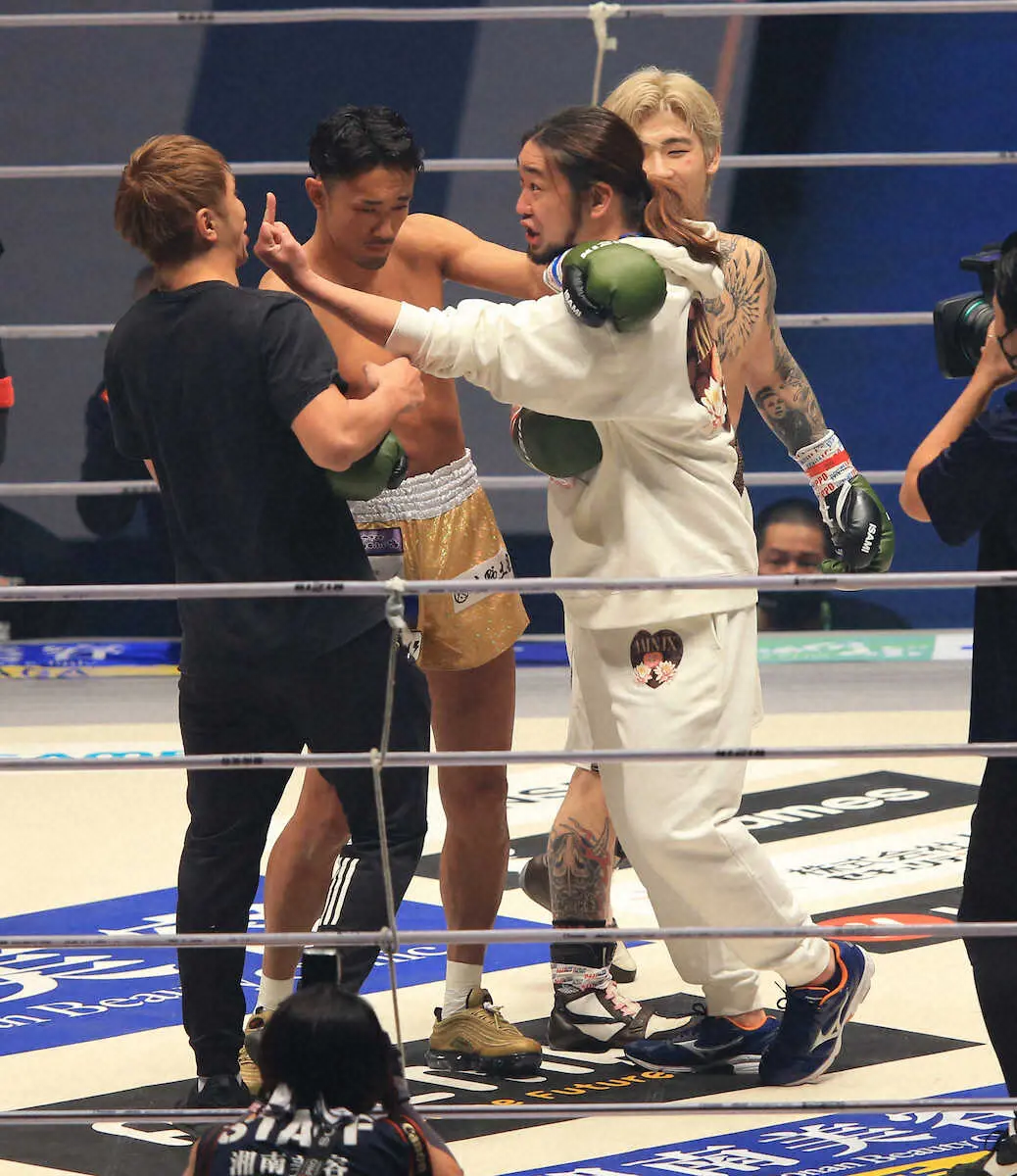 <RIZIN40>第6試合平本蓮・梅野源治 平本のセコンドについたシバターが梅野のセコンドの久保優太を挑発(撮影・篠原岳夫) Photo by スポニチ 【RIZIN】まさかのシバタ―登場にネット反響!久保優太との因縁再び「面白す… ギャラリーで見る この記事のフォト 2022年12月31日の画像一覧 もっと見る 2022年12月31日の画像をもっと見る