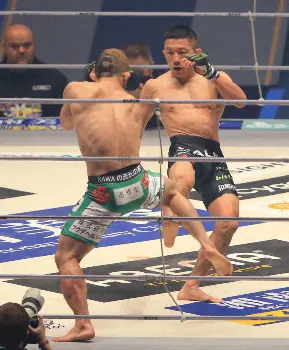 堀口は1Rで強烈なカーフキックを浴びせ扇久保の左足にダメージを蓄積させると、バランスの崩し倒れた相手の上から容赦のないパウンド攻撃。序盤から圧倒する展開のままペースを渡さず終了のゴング。安定感抜群の戦いで3―0判定勝利を飾り、ベラトール勢無傷3連勝で残り2戦を残し勝ち越しを決めた。