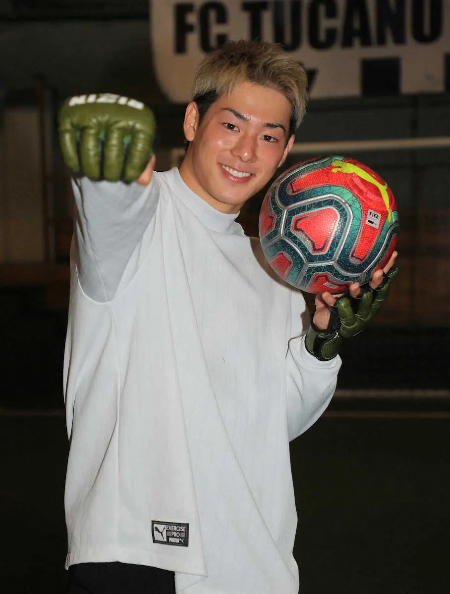 <三浦孝太公開練習>ボールを持って拳を突き出す三浦孝太(撮影・篠原岳夫)