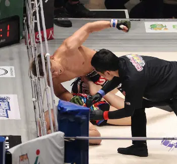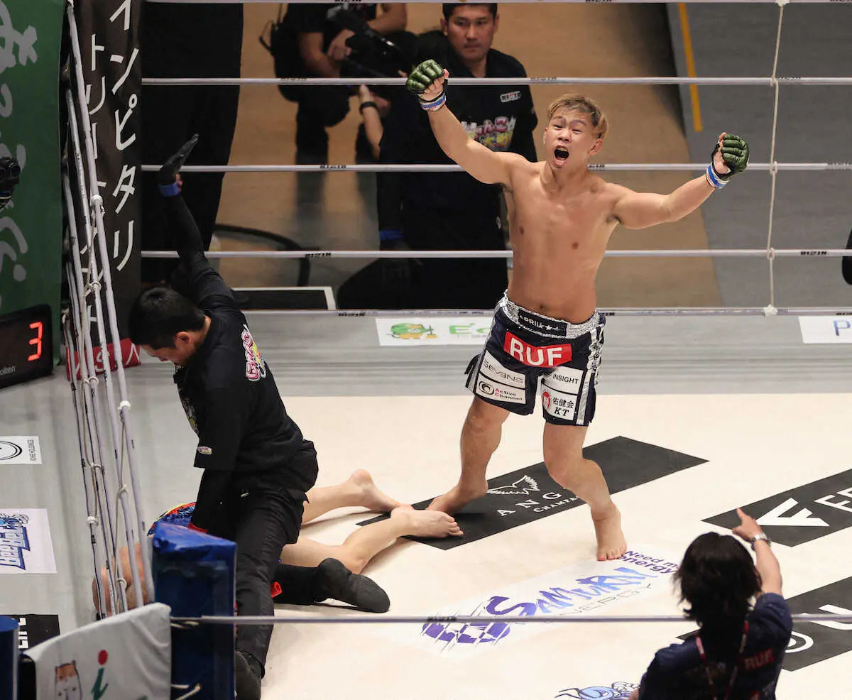 MMAデビュー戦を白星で飾り「練習でやってきたことが試合で出たので“これがMMAか”って感じで楽しかった」と満足感を示した。最後はパウンドでの決着。「キック(ボクシング)にはないので、効いているか分からなかったからガードの上からフルスイングで。気持ちよかった」と振り返った。