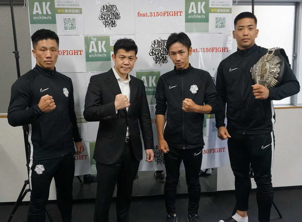 8月の興行でタッグを組む六島ジムの(左から)山崎海斗、3150FIGHTの亀田興毅氏、六島ジムの武市晃輔トレーナー、日本ミドル級王者の国本陸