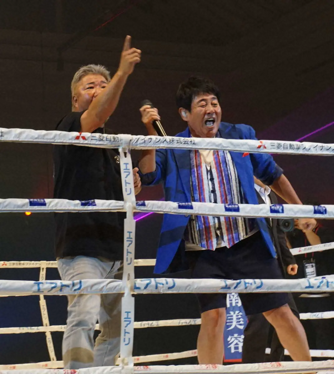 3150FIGHTでハーフタイムショーに登場したTUBEのボーカル、前田亘輝(右)と亀田史郎トレーナー