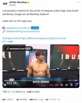 米国プロレス団体「AEW」が27日に英国・ウェンブリースタジアムでビッグマッチ「ALLIN」を開催した。第2試合に飯伏幸太(41)が“親友”ケニー・オメガ、アダム・ペイジとタッグを結成して、ジェイ・ホワイト、ジュース・ロビンソン、竹下幸之介と対戦。最後はケニーが竹下に丸め込まれて敗戦した。