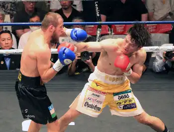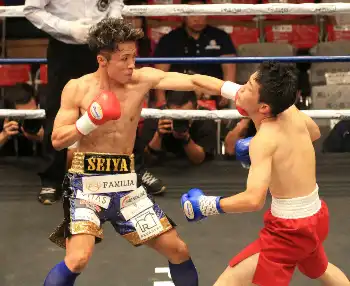 山口聖矢(右)は加藤蓮を1RでTKOする(撮影・西川祐介)