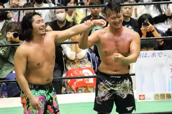 試合後に記念撮影をするフジタ”Jr”ハヤトと高橋ヒロム(右・撮影・酒井卓也)