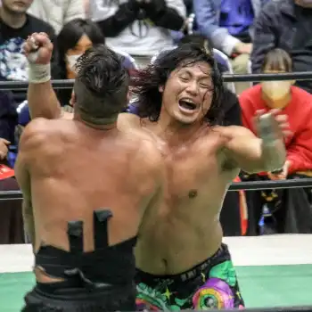 「きょう引退してもいいと思って、毎試合リングに上がっています。きょうもそのつもりでいました。こんな最強でかっこいい奴に負けたまま終わるのは俺っぽくないので、あなたを追いかけて勝つまで引退しないでおこうかなと思える試合ができて、マジで幸せです。本当にありがとうございました」と試合後の心情を吐露して、ヒロムと抱擁した。