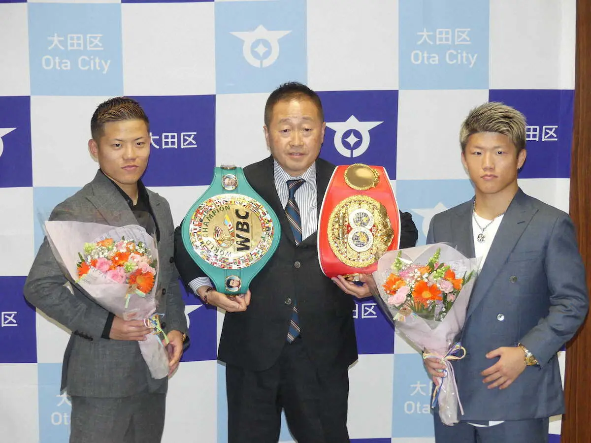 プロボクシングWBC世界ミニマム級王者で重岡兄弟の兄・優大(26=ワタナベ)とIBF同級王者の弟・銀次朗(24=同)が20日、東京・大田区役所を訪れ今年10月に大田区総合体育館でそろって正規王者となったことを鈴木晶雅区長に報告した。