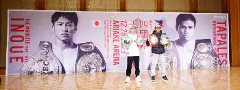 タパレス(右)と握手を交わす井上(撮影・島崎忠彦) Photo by スポニチ 井上尚弥 26日の4団体王座統一戦へ タパレスと笑顔で握手「いよいよだな… ギャラリーで見る この記事のフォト 2023年12月24日の画像一覧 もっと見る 2023年12月24日の画像をもっと見る