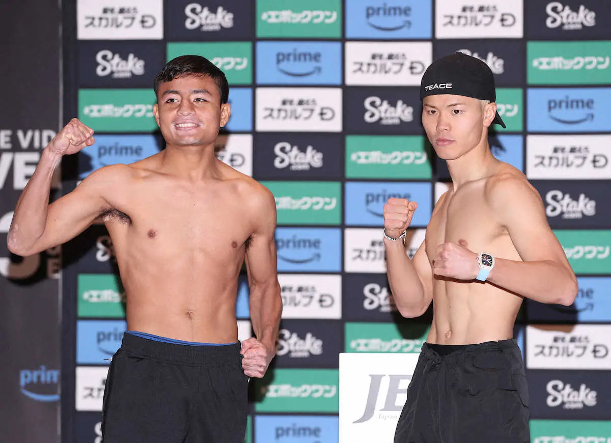 前日計量をクリアし、ポーズを取る那須川天心(右)とルイス・ロブレス Photo by スポニチ 那須川天心 進化ボディーを自賛「脂肪削ってしっかり仕上がった」 水抜… ギャラリーで見る この記事のフォト 2024年01月23日の画像一覧 もっと見る 2024年01月23日の画像をもっと見る