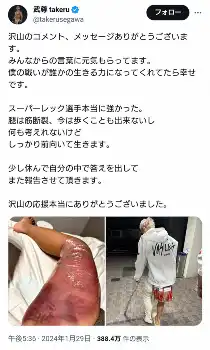 武尊 Photo by スポニチ 武尊 膝2カ所骨折していた「足の腫れが引いてMRI検査」で判明「1Rで膝が… ギャラリーで見る この記事のフォト 2024年02月22日の画像一覧 もっと見る 2024年02月22日の画像をもっと見る