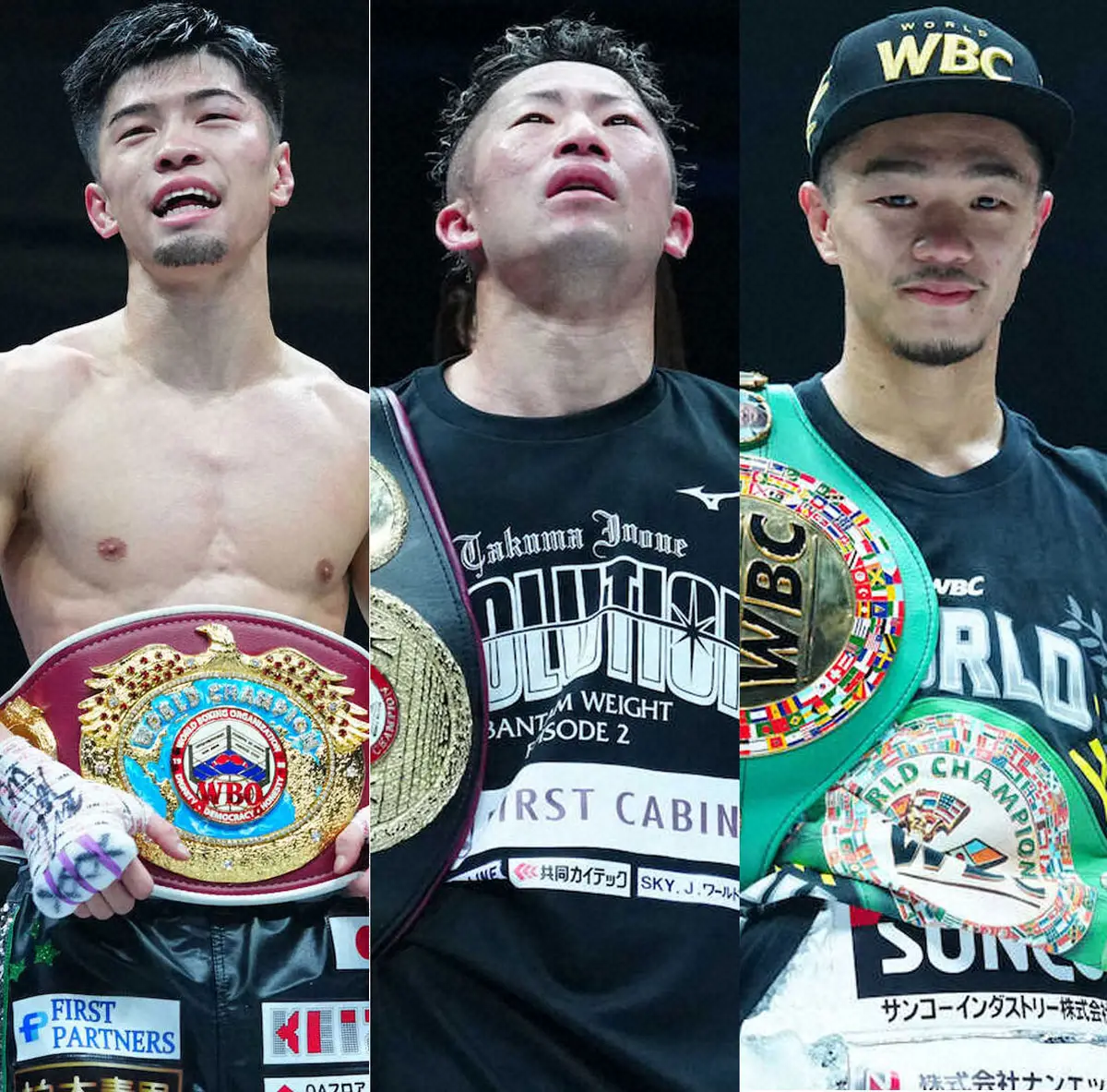 (左から)史上最速で4階級制覇を成し遂げた田中恒成、メインで初防衛し涙の井上拓真、6回TKOで3階級制覇を決めた中谷潤人