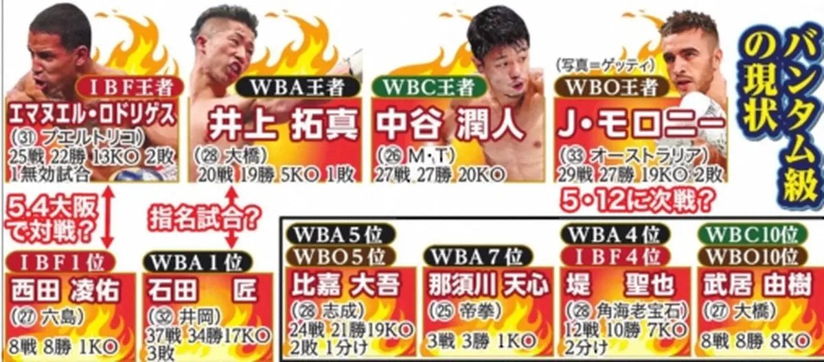 最激戦区のバンタム級。(左上から時計回り)中谷潤人、井上拓真、武居由樹、那須川天心 Photo by スポニチ 内藤大助氏「攻略が難しいボクシングスタイルで強かった」 “最激戦区”バ… ギャラリーで見る この記事のフォト 2024年02月26日の画像一覧 もっと見る 2024年02月26日の画像をもっと見る