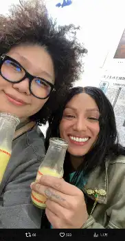 自身のインスタグラムのストーリーズには花柄のサングラスを付けて黒ミニスカートスーツ姿を投稿した。