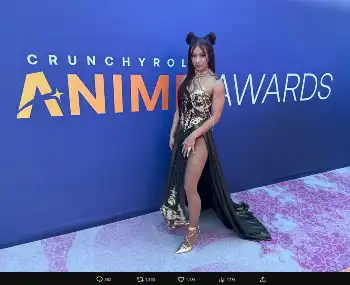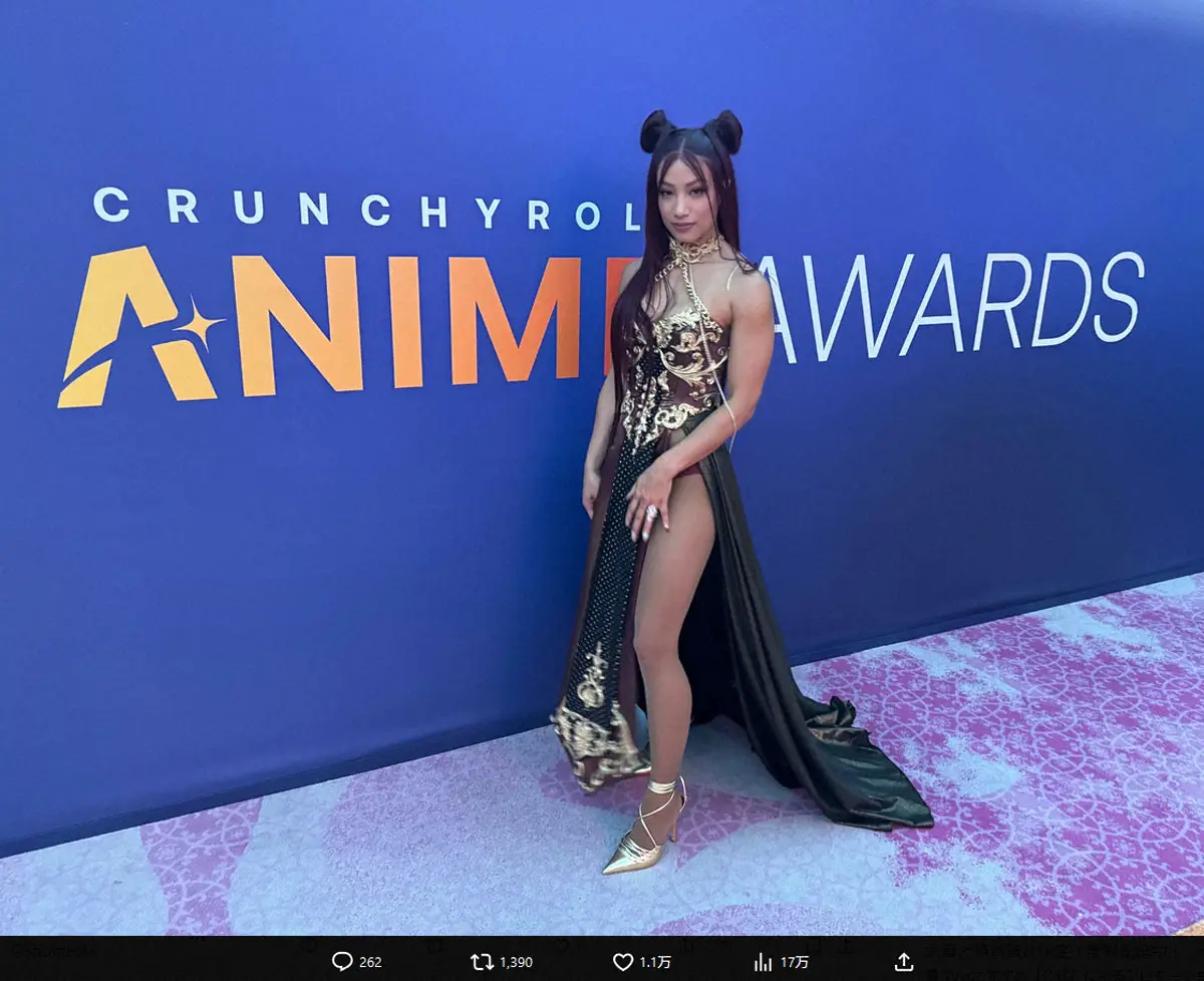 モネはツインお団子ヘアーでスリットの入った豪華なドレスで「クランチロールアニメアワード」の看板の前で記念撮影。自身のX(旧ツイッター)では微笑んでいる絵文字と日本国旗を投稿した。