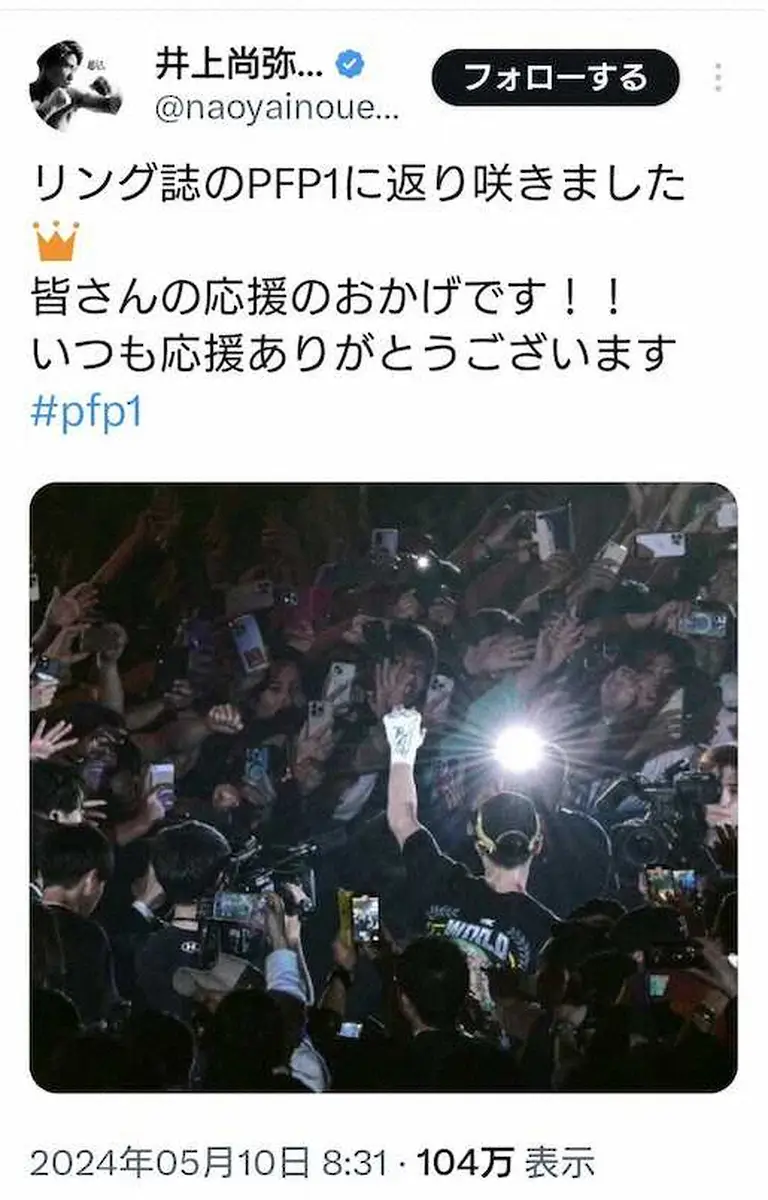 軽量級でPFP1位は井上の他にローマン・ゴンサレスしかおらず、返り咲きは過去4人しかいない。所属ジムの大橋会長も「東京ドームでの歴史に残る一戦を終えてまだ興奮冷めやらぬ状況で、またまたビックリですがこれも井上尚弥、井上真吾トレーナーの努力」と喜びを口にした。