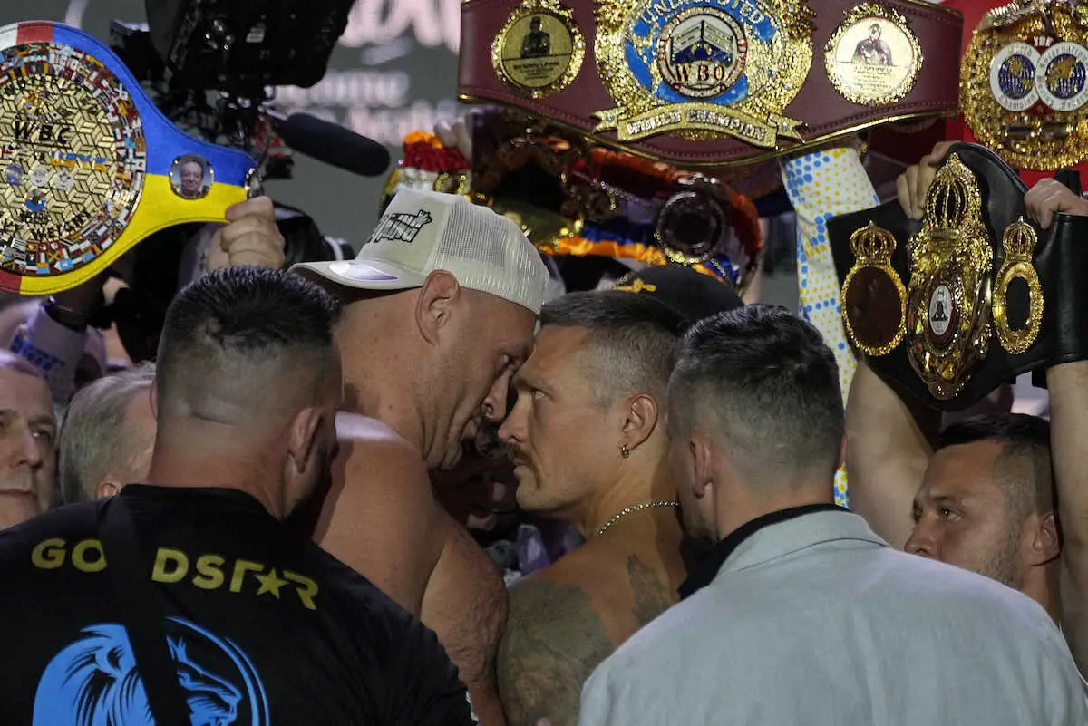 プロボクシング世界ヘビー級4団体王座統一戦の公式計量が17日(日本時間18日)、サウジアラビアのリヤドで行われた。ヘビー級史上初の4団体王座統一を目指す2人は、WBC同級王者タイソン・フューリー(35=英国)が262ポンド(118・8キロ)、WBA&IBF&WBO同級王者オレクサンドル・ウシク(37=ウクライナ)が233・5ポンド(105・9キロ)をマーク。2メートル6のフューリーが昨年10月の前戦よりも約7キロ軽く仕上げてきたのに対し、元々は1階級下のクルーザー級4団統一王者だった1メートル91のウシクは自身最重量のウエートで、フューリーとのフィジカルバトルに臨む覚悟をうかがわせた。