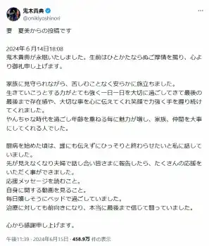 鬼木さんは5月に入ってからステージ4のがんで闘病中であることを告白。さらに「医師からもこれ以上手立てがありませんと告げられ、医師から告げられた余命も残り2ヶ月をきりました」とすでに余命宣告されていと公表していた。