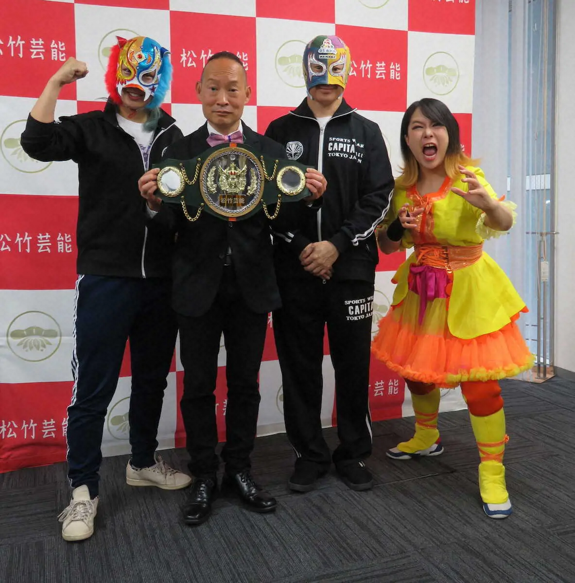 チャンピオンベルトも披露され、同プロレスのリングアナでもあるお笑いコンビ「シンデレラエキスプレス」の渡辺裕薫(56)は、松竹の大道具が作成したことを明かし「横山たかし師匠(故人)の金ピカ車いすを作ったところです。金の部分は同じものが使われていて“たかしイズム”が受け継がれています」と胸を張った。