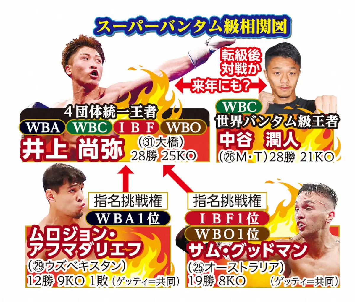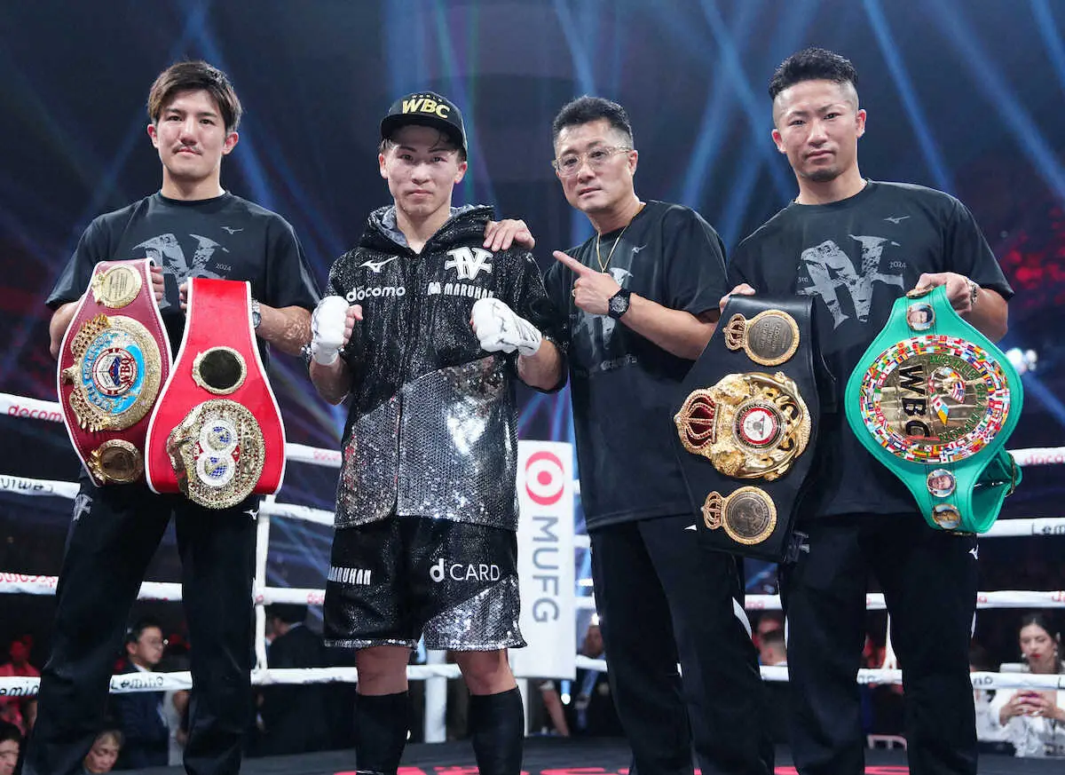 <ダブル世界戦 井上・ドヘニー>防衛に成功した井上。左からいとこ・浩樹、井上、弟・拓真、父・真吾トレーナー(撮影・島崎忠彦) Photo by スポニチ 尚弥の次戦は国内でグッドマンとの指名試合が有力 その先に米国、そして“… ギャラリーで見る この記事のフォト 2024年09月03日の画像一覧 もっと見る 2024年09月03日の画像をもっと見る