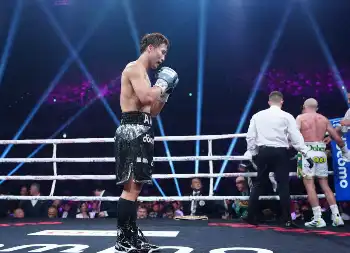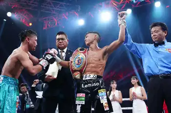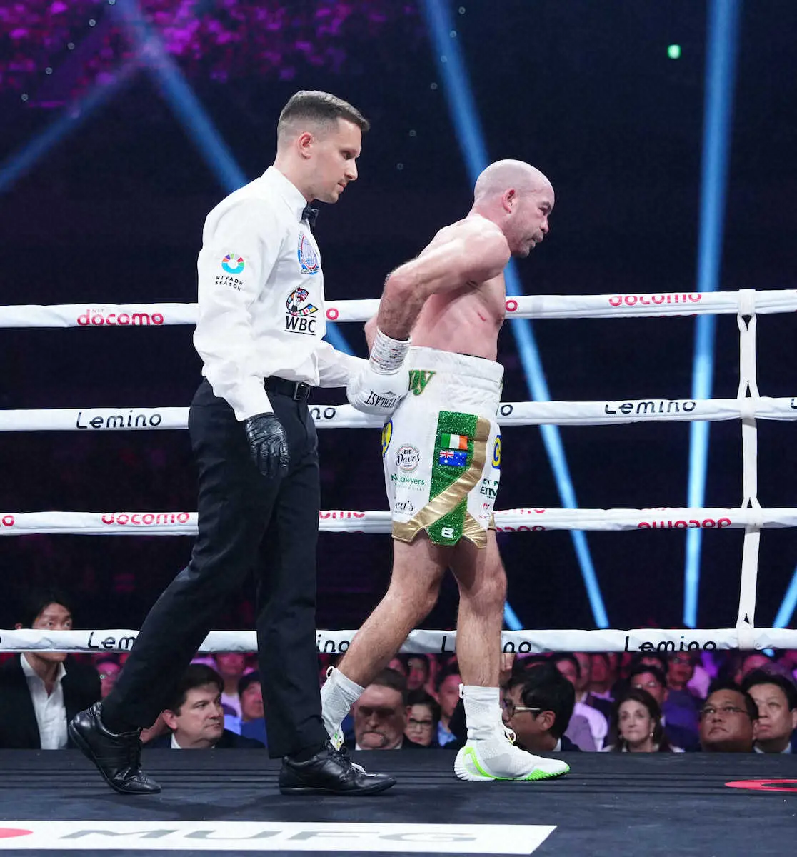 ドヘニーは7回、井上尚のラッシュを浴びると腰に手を当てて動きを止め、座り込んで立てなくなった。足を引きずるしぐさも見せた挑戦者に、レフェリーが試合をストップ。まさかの結末に会場からは大きなどよめきが起こった。